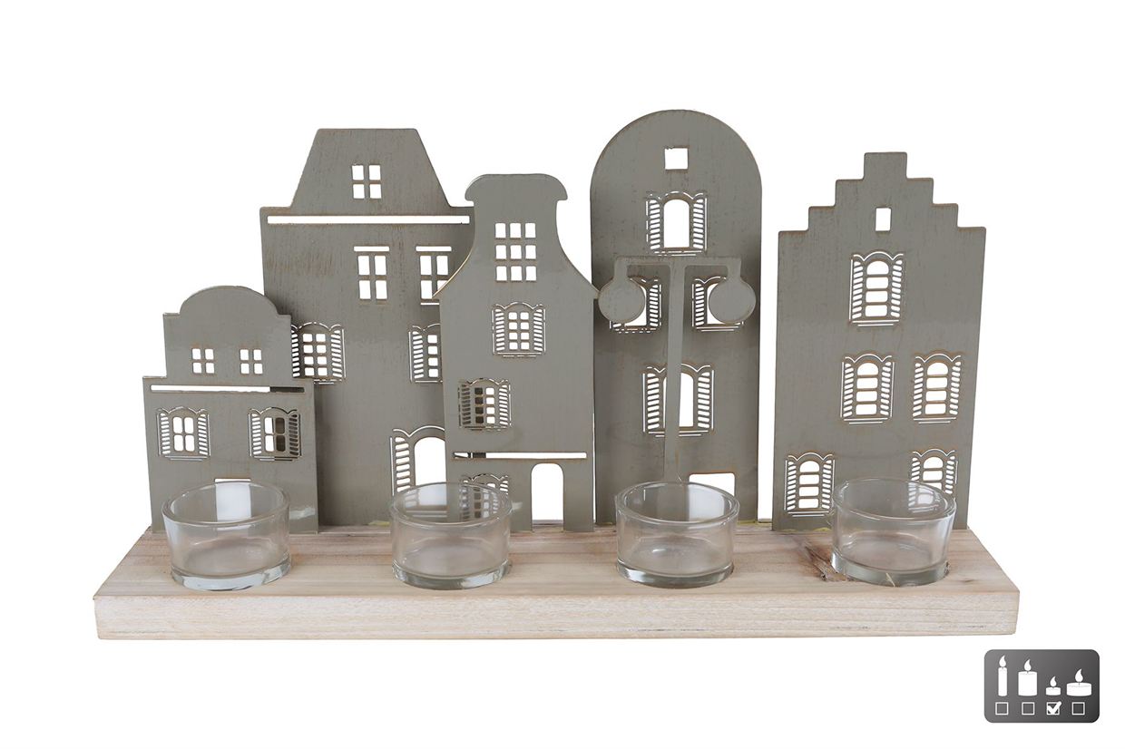 Materiál: kovové domky, dřevěná podložka, skleněné kalichy